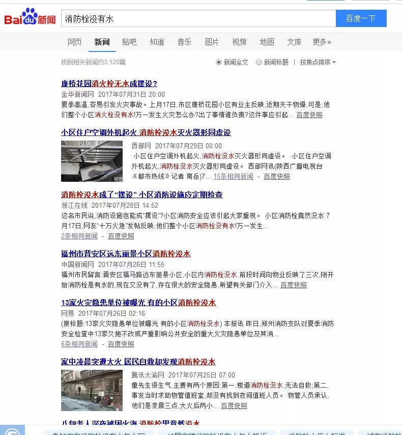 百度搜索“消防栓没水”,发现3120多篇相关的新闻报道,都是因为发生火灾的时候,消防栓内没有水成为了摆设,给人民群众的生命财产安全造成了重大损失。
